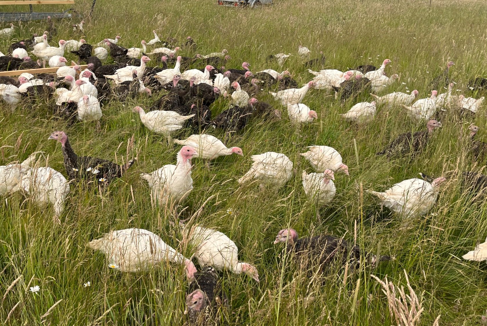 Das Geheimnis: Täglich frische Wiese zum jagen und sammeln. Wenn wir die Puten ihre Bedürfnisse ausleben lassen entfalten sie sich ganz anders als bei Stallhaltung. Unsere Puten ziehen die Schafen hinterher und beweide die Streuobstwiese. Sie jagen Insekten und schlafen auf einem für sie umgebauten Bootsanhänger mit Dach. Das Gras ist super gesund und die Puten lieben es.